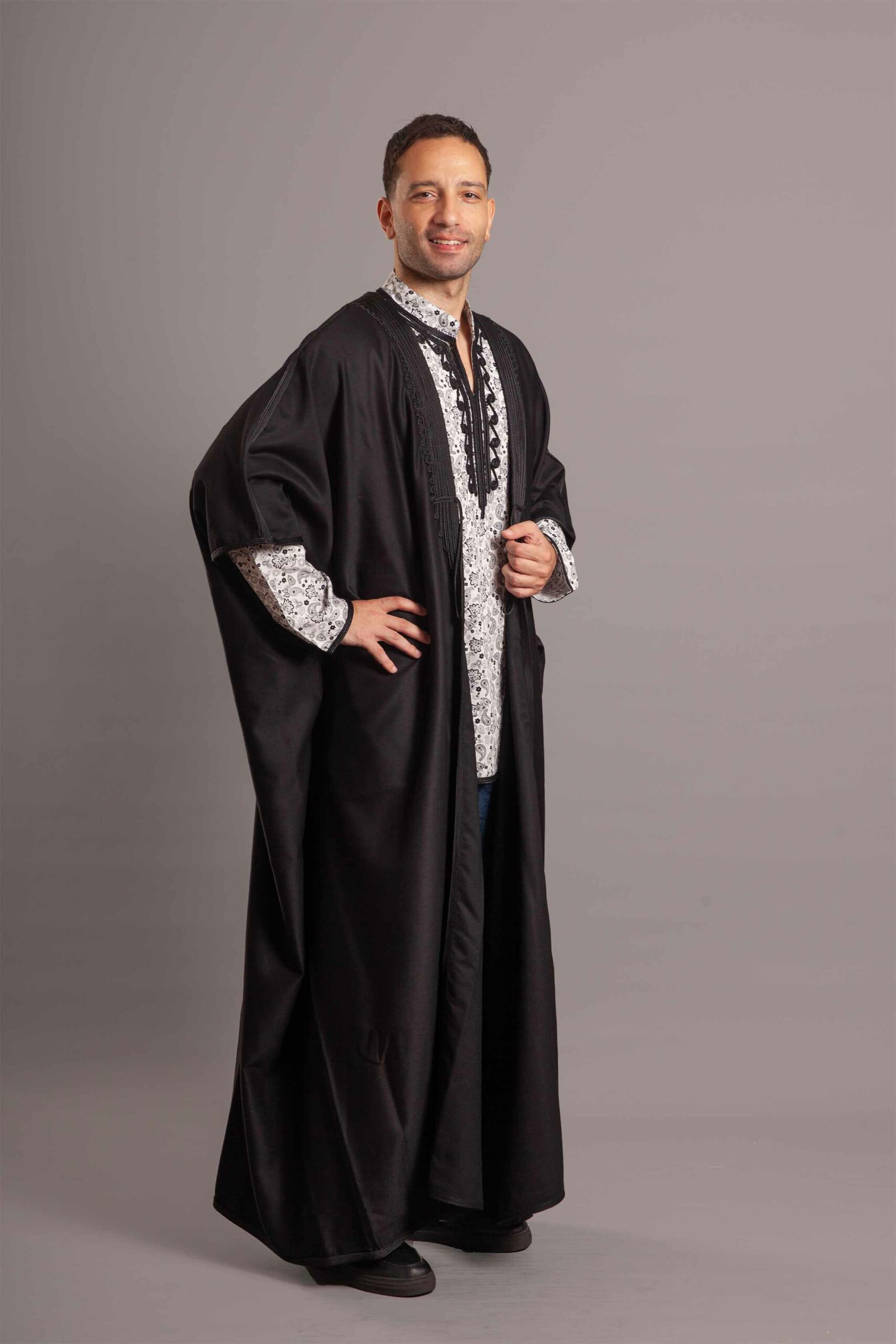 Black abaya with black kottan embroidery.