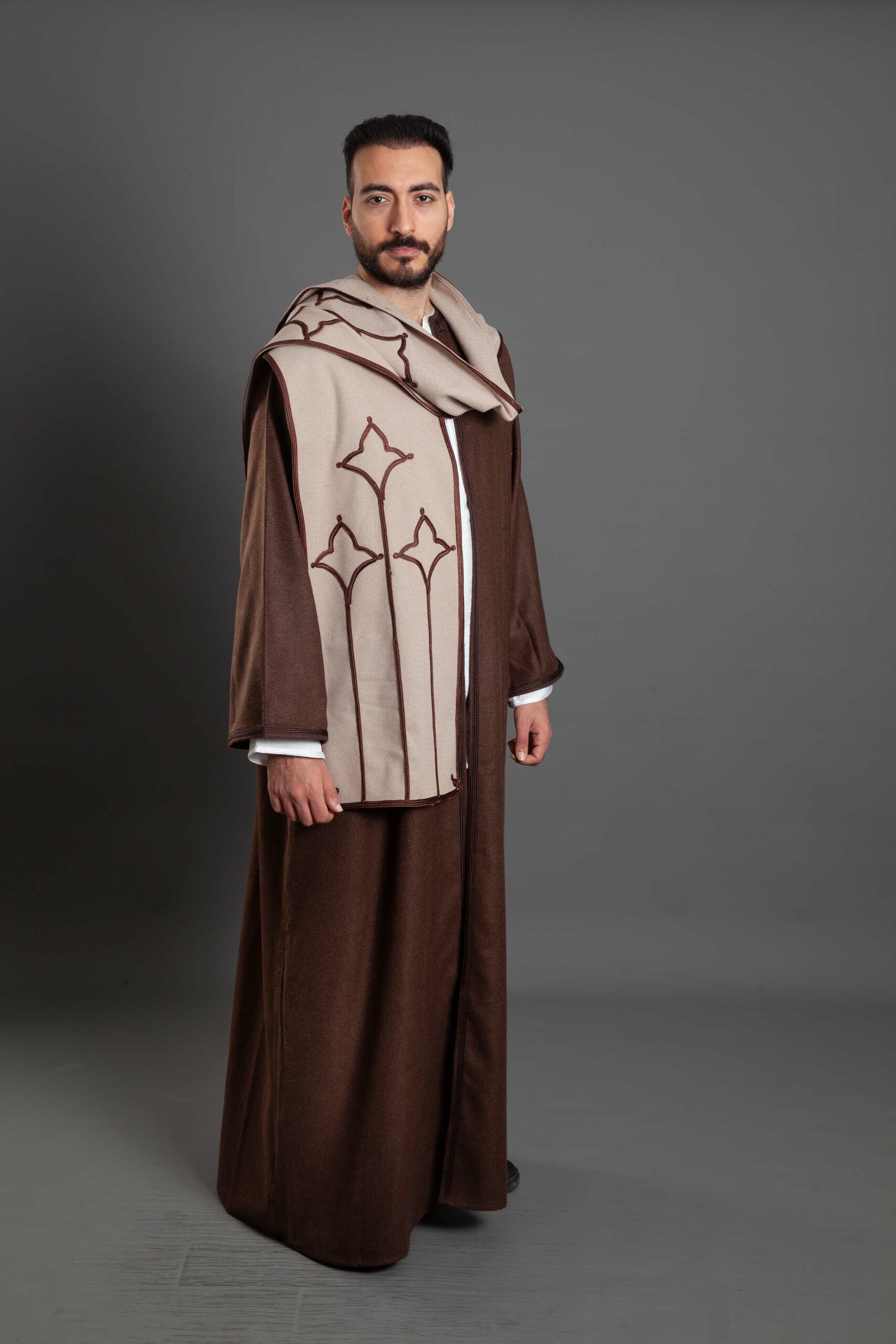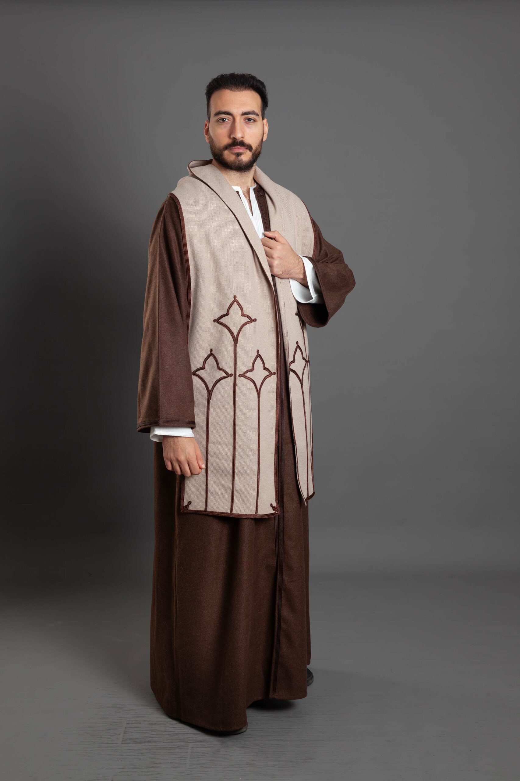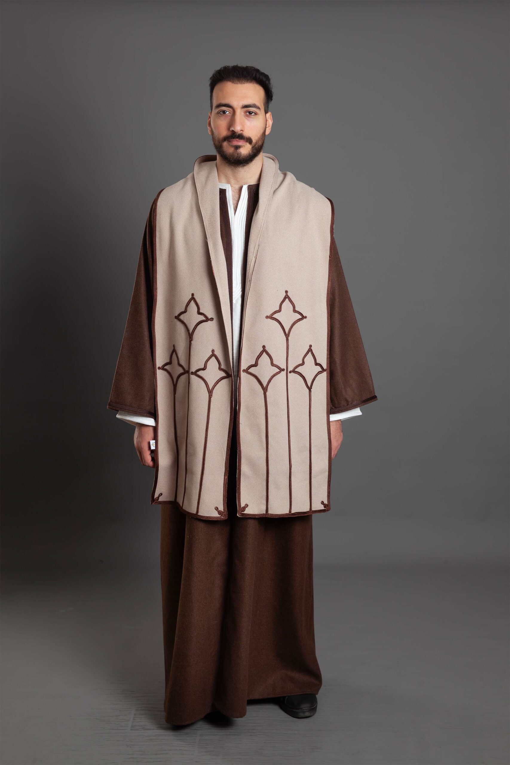 The soft, neutral tones (like the cream/beige shown) perfectly complement the rich brown wool garment, making it a versatile and striking accessory.