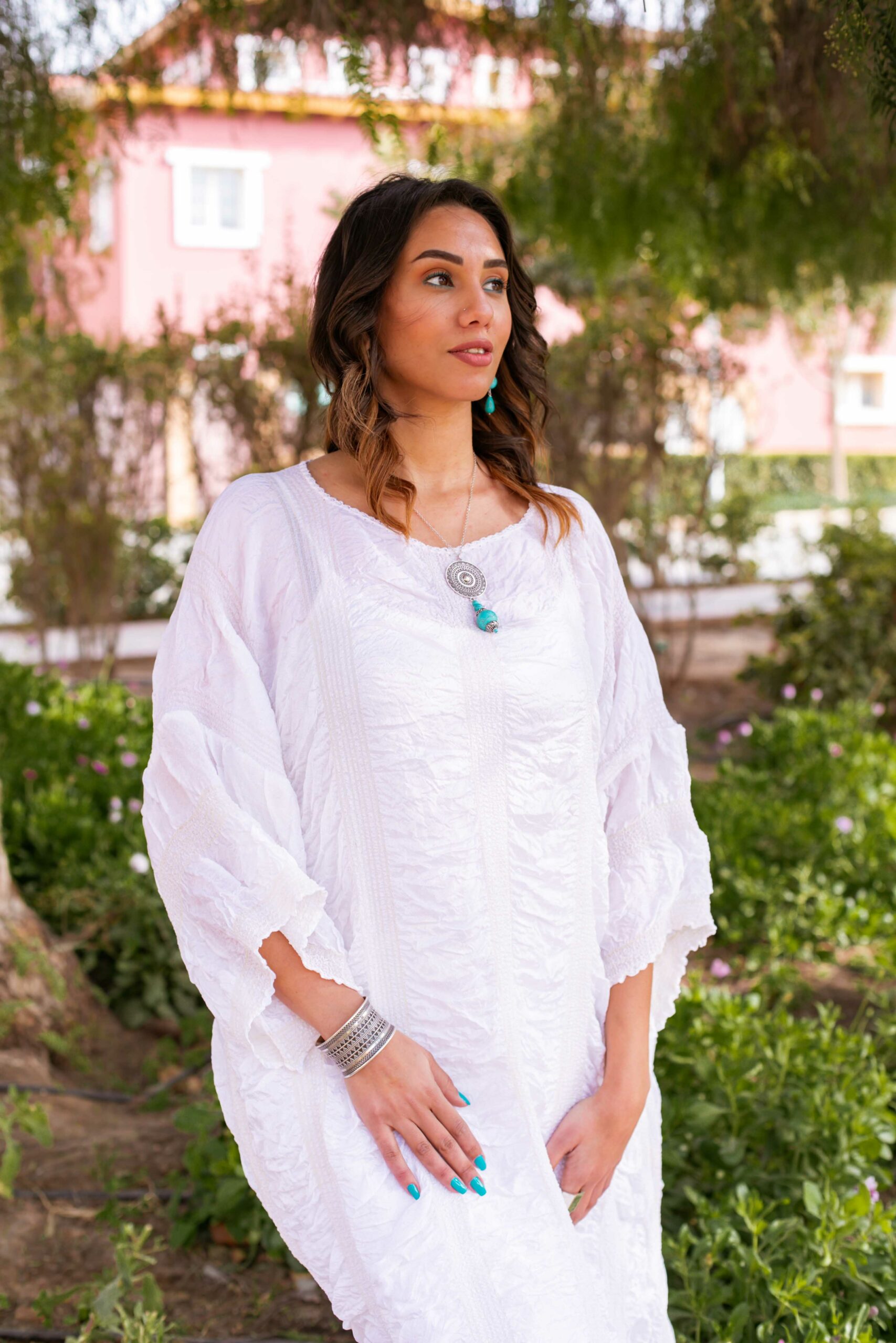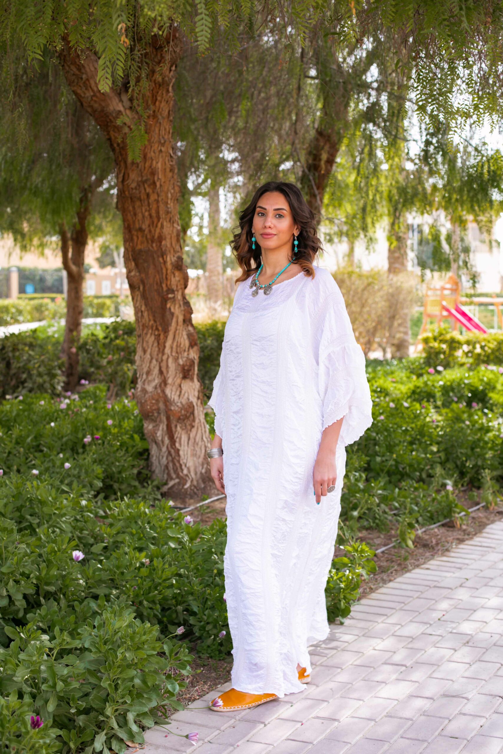 A white dress designed with a loose, flowing cut that combines comfort with elegance.